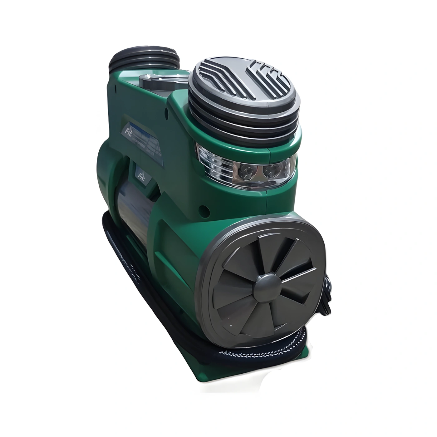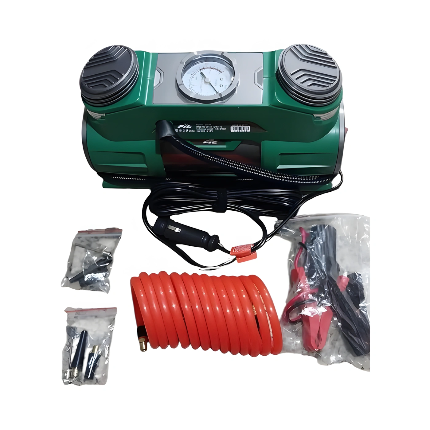 كمبروسر FIT المزود بمحركين (2 بستم) يقدم لك قوة ضغط عالية تتيح تصريف هواء يصل إلى 40 لتر/دقيقة، مما يجعله مثاليًا لنفخ إطارات السيارات بسرعة وكفاءة. يعمل بجهد 12 فولت ويتميز بتصميم مدمج يسهل حمله واستخدامه في أي وقت، ليكون رفيقك الموثوق أثناء السفر والطوارئ.